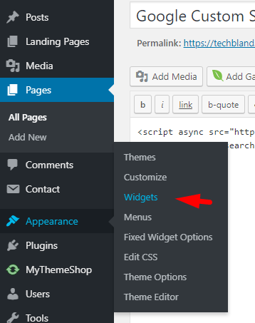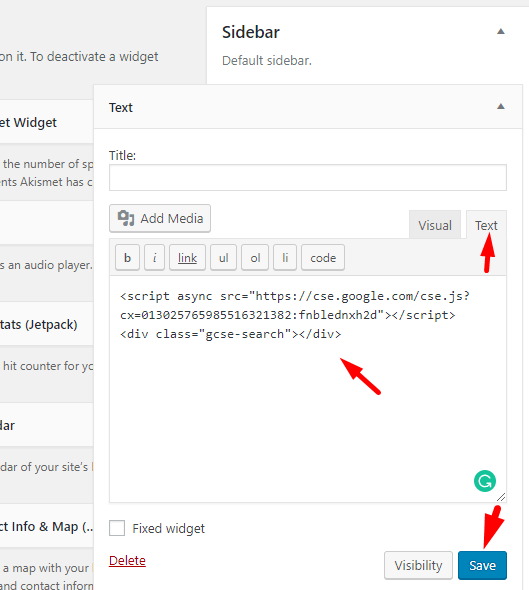 Step 3: Once again you need to copy the code, then, go to your website dashboard and tap on Appearance > Widgets. here, find Text widgets from the left side of the page and add the widgets to Sidebar. afterward, open widgets and click on Text option and paste the CSE code and click on the Save button.