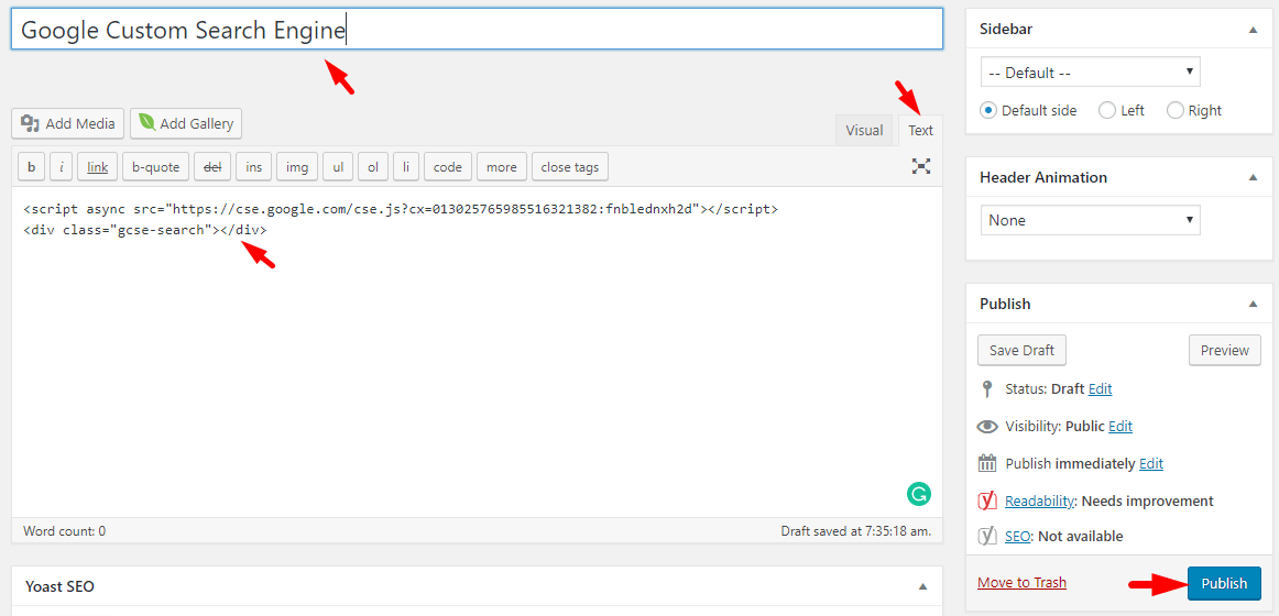 Step 6: Once, you copied the code, then go to your website dashboard and tap on Pages > New Page. after that, give a title and paste the code on the body section. make sure, you have clicked on Text. Now, that you are done with this then click on Publish.