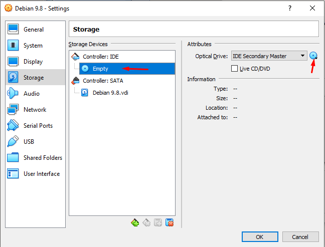 #4. ok, now its time to insert Debian ISO file so for that go to Storage and click on Empty option and then click on small CD icon, while you clicked on CD icon then click on the first option. then select the ISO file you downloaded earlier.