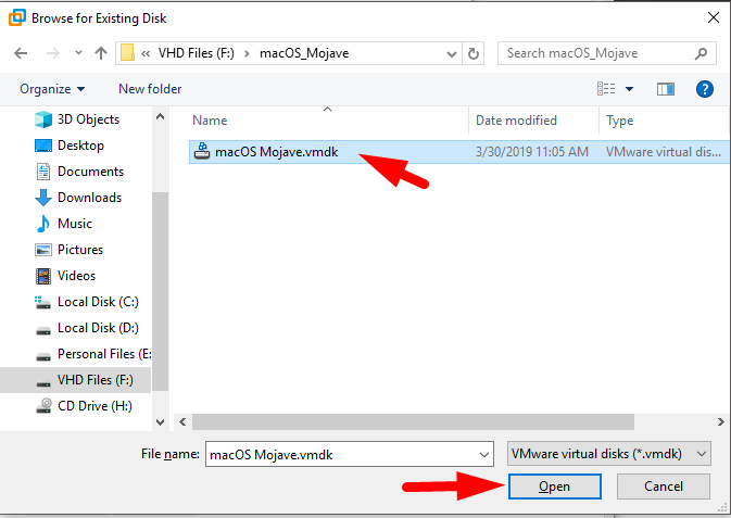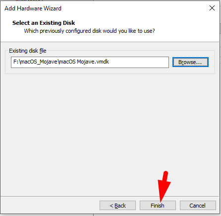 #7. In the last step, Verify the MacOS Mojave 10.14.1 VMDK file. Therefore, to add MacOS Mojave 10.14.1 click the Browse button and find the VMDK file that you extracted before. then while you find it then Open it and click the Finish and Click the Ok button.